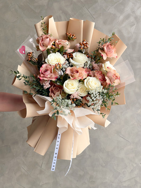Assorted flower in natural nude color palette. Flowers are Holland roses, Hypericum berries, Rice flower,...