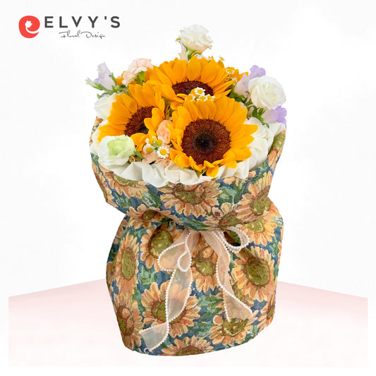 Flower DetailsMain: Sunflower, carnations, and lisianthusFiller: ChamomileSize: Approx. 50.8cm This bouquet is all beautifully presented...