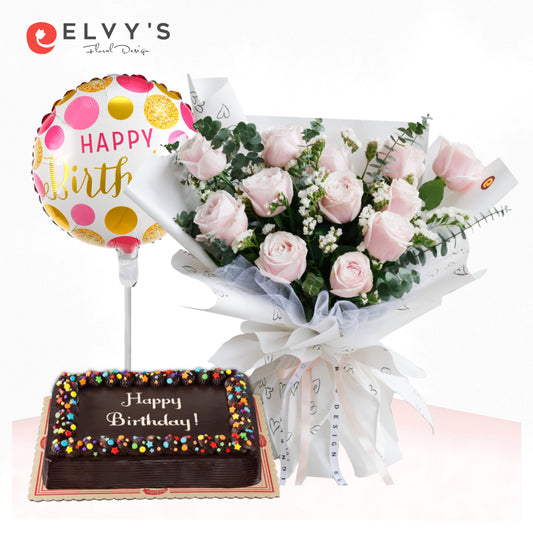 Product Details: 1 dozen Holland Roses with statice and eucalyptus fillers 1 HBD Mylar balloon8x12...