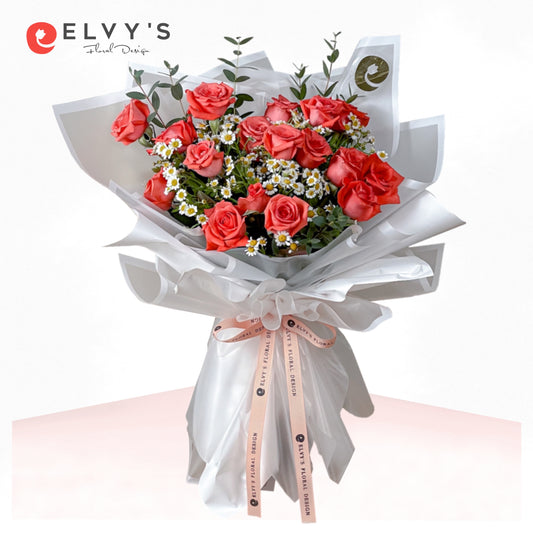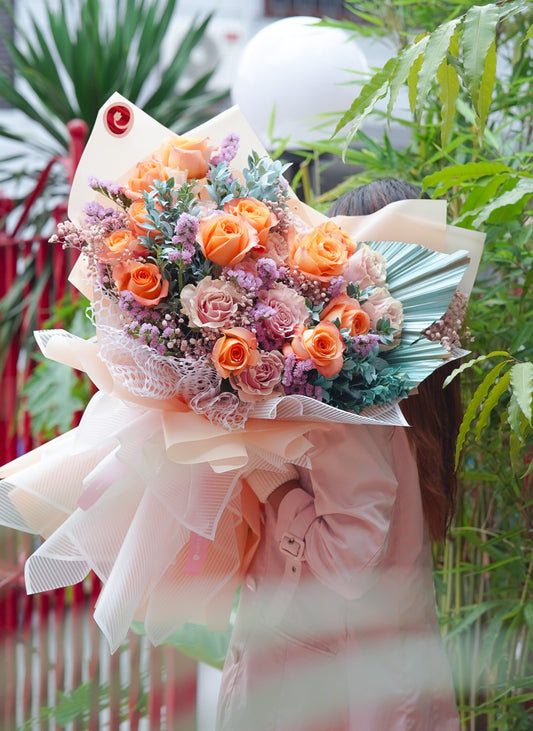 Experience the vibrant charm of our bouquet featuring 2 dozen pomelo orange local roses. These...