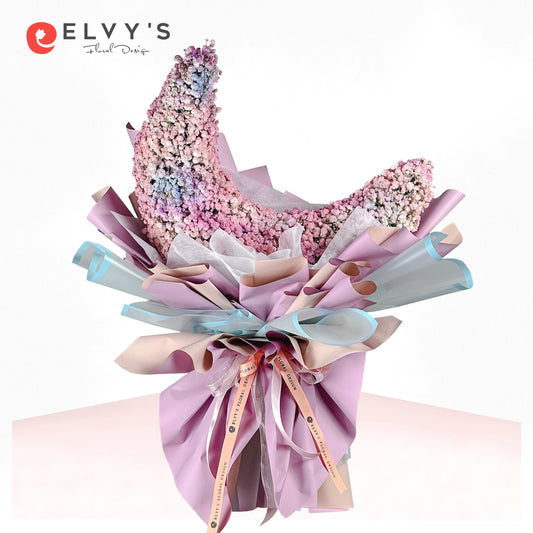 Step into a magical dreamscape with our moon-shaped gypsophila arrangement adorned with twinkling fairy lights...