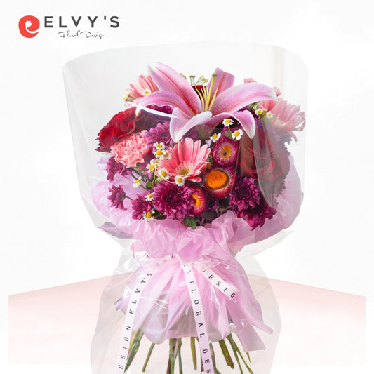 Product Details: Main Flowers: Stargazer, Holland Tulips, Holland Roses, Lisianthus Fillers: Pingpong, Carnations, Matthiola, Lagurus...