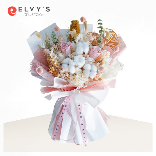 Flower Details Main: Preserved roses, gypsophila, native anahaw leaves Filler: Misty, ferns, rice flowers, and...