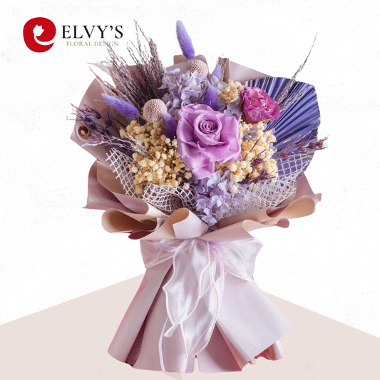 Product Details Main Flowers: Preserved Rose (Lilac) Gypsophila (White) Craspedia (Lilac) Hydrangeas Fillers: Whisk Lagurus...