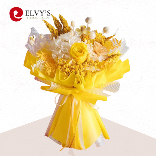 Product Details Main Flowers: Preserved Rose (Yellow) Craspedia (White) Iryngium Hydrangeas Fillers: Gypsophila Ruscus Matthiola...