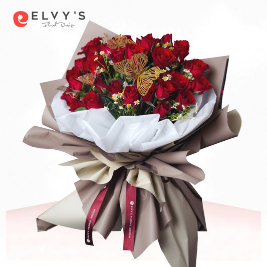Flower DetailsMain: Four dozen of Philiipine rosesFiller: ChamomileIncluded: Artificial butterfly The vibrant red roses symbolize...
