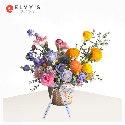 Flower details:Main: Holland roses, gerbera, mattiola, orchids, carnations, and lisianthusFiller: Oxypetalium, and greenery foliageIncluded: BasketSize:...