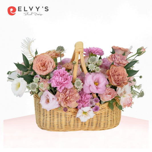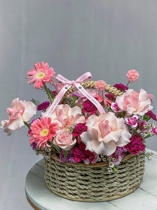 Flower detailsMain: Holland roses, carnations, and lisianthusFiller: Astrantia, and dried fernIncluded: BasketSize: Approx.27.94cm We created...