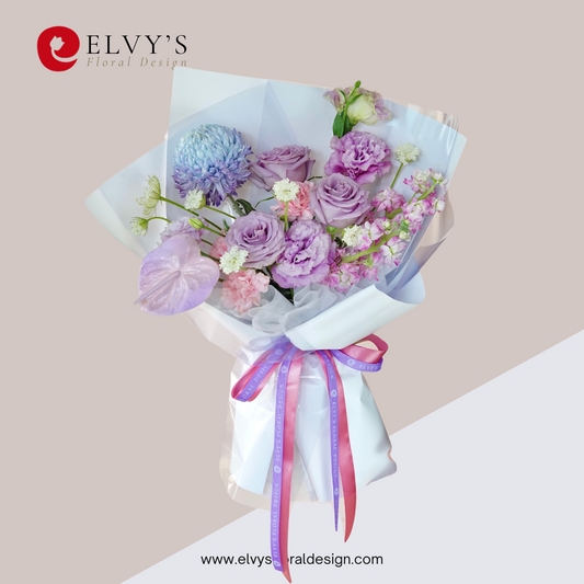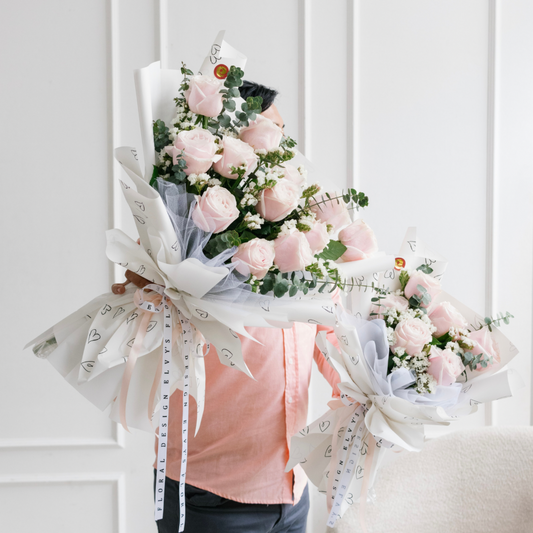 Flower DetailsMain: Holland rosesFiller: Statice, and eucalyptusSize: Approx.S:30.48cm M:38.1cm L:45.72CM This bouquet creating a mesmerizing...