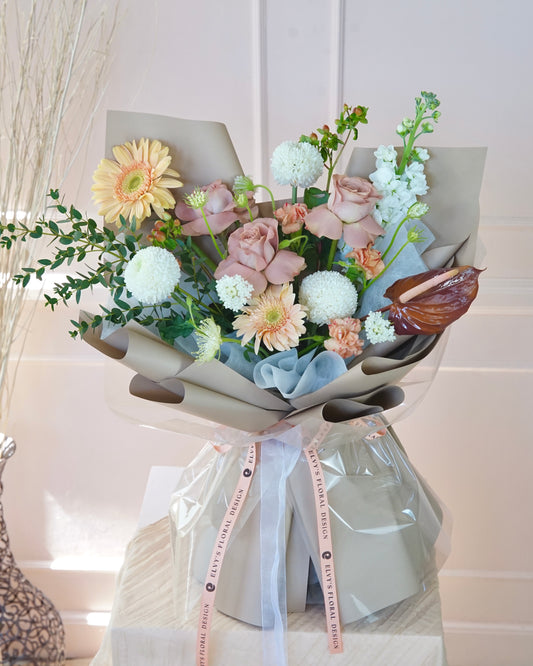 Product Details: Main Flowers: Holland Roses, Lisianthus, Mattiola Fillers: Fresh Eucalyptus Leaves, Chamomile Arrangement Style:...