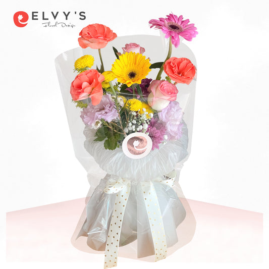 Product Details: Mini bouquet in Korean Style Arrangement Flower Inclusions: Holland rose, Gerbera's daisies,...
