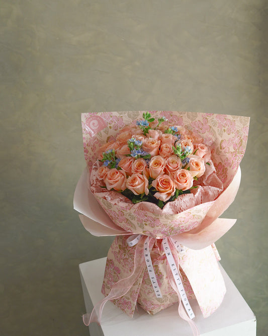 Flower DetailsMain: 33 pieces of Holland rosesFiller: Star blueSize: Approx.50.8cm The passionate hue of salmon...