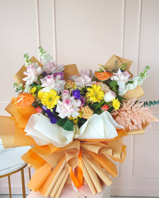 Flower DetailsMain: Lavender roses, purple carnations, and pink lisianthusFiller: Limonium, snapdragons, and greenerySize: Approx. 45cm...