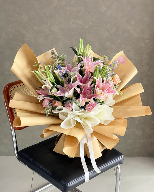 Flower DetailMain: Stargazer, carnations, and Holland rosesFiller: Snow in the mountain, consolidad ajacis, queen annesSize:...
