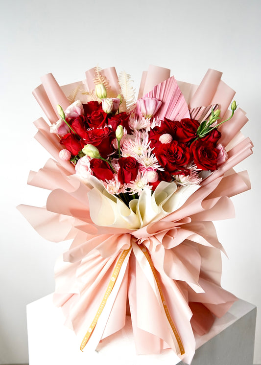 Product Details Main Flowers: Ecuadorian Roses, Pink Mums Fillers: Pink Lisianthus, Craspedia Description: Ecuadorian red...