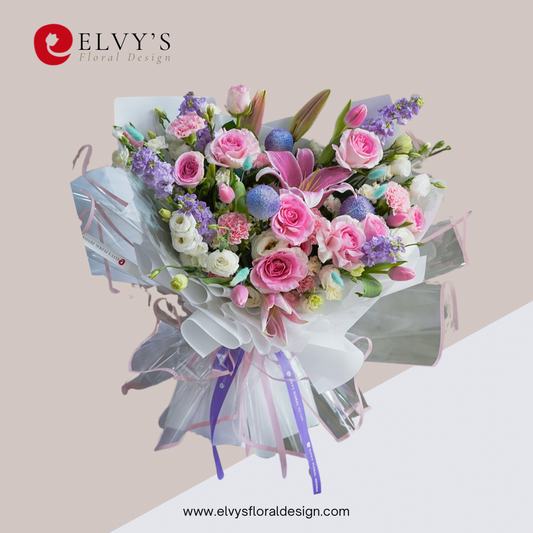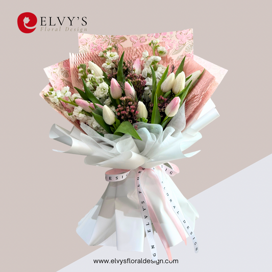Product Details: Main Flowers: Stargazer, Holland Tulips, Holland Roses, Lisianthus Fillers: Pingpong, Carnations, Matthiola, Lagurus...