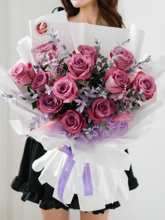 Indulge in the beauty of deep purple Ecuadorian roses with our captivating bouquet. Enhanced with...