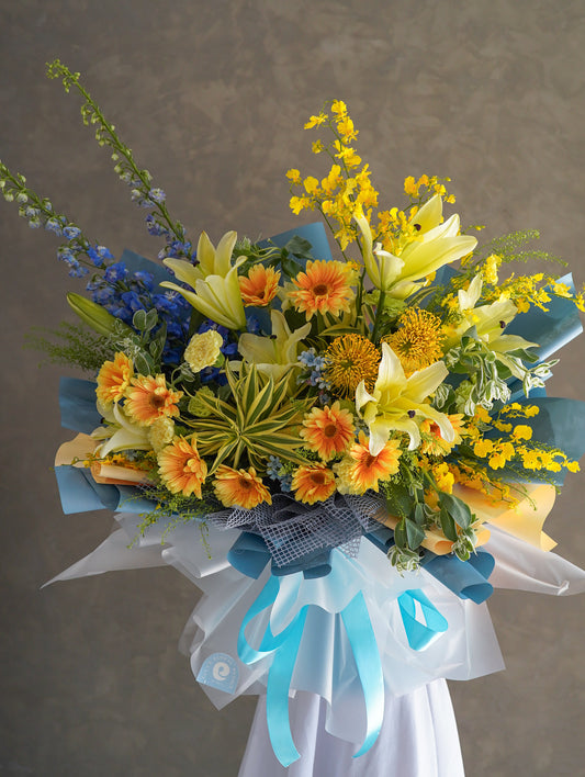 Flower detailsMain: Lilies, gerbera, delphinium, leucospermum, carnations, and dancing ladyFiller: Snow in the mountain leaves,...