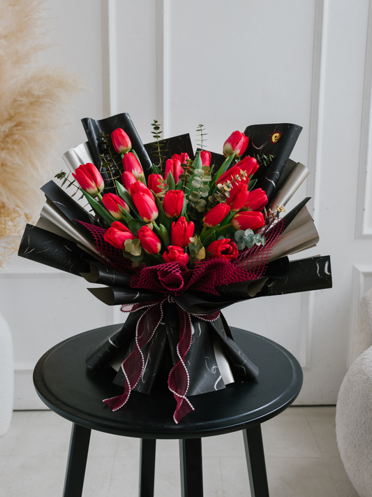 Product Details: Crimson Main Flowers: 24 Red Holland Tulips Fillers: Eucalyptus Foliage Size: Approx. 50–60...