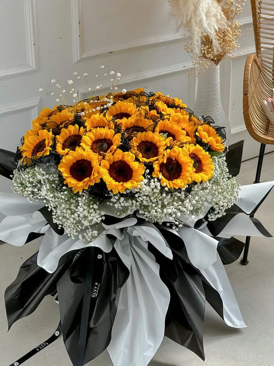 Product Details: Jardin de Soleil Main Flowers: 30 Sunflowers Fillers: Baby's Breath Accessory: Elegant Crown...