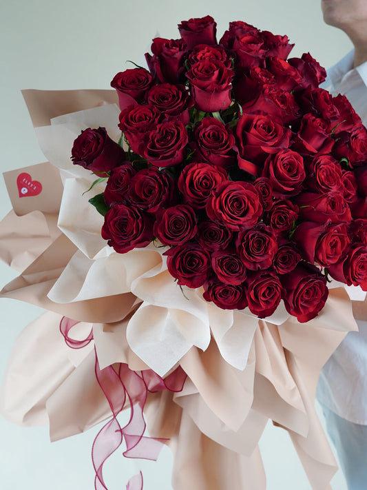 'Forever Yours': A timeless declaration of love. Delight in 50 deep red holland roses elegantly...