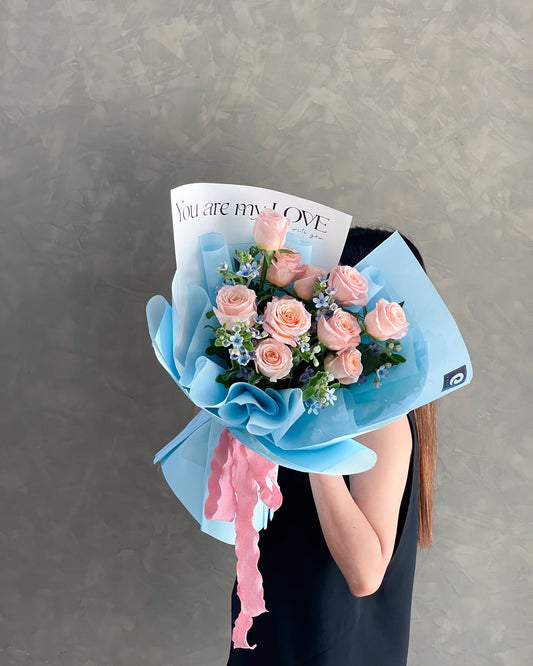 Flower DetailMain: 11 pieces of Holland rosesFiller: Star blueSize: Approx.50.8cm The passionate hue of salmon...