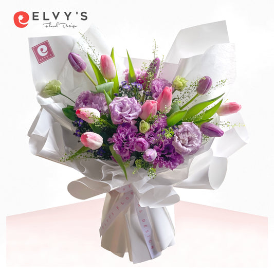 Product Details: Main Flowers: One Dozen Holland Tulips, Lisianthus Fillers: Greenery Foliage Size: Approx. 50–60...