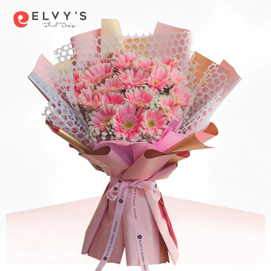 Product Details: 20 stems gerbera daisies with gypsophila fillers in arm design arrangements. Our commitment...