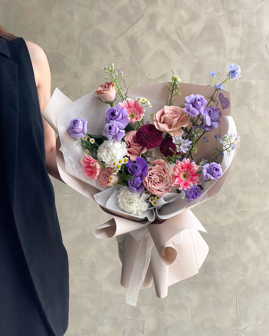 Flower DetailsMain: Holland roses, gerbera, lisianthus, and carnationFiller: Consolidad ajacis blue, chamomile, and pingpongSize: Approx....