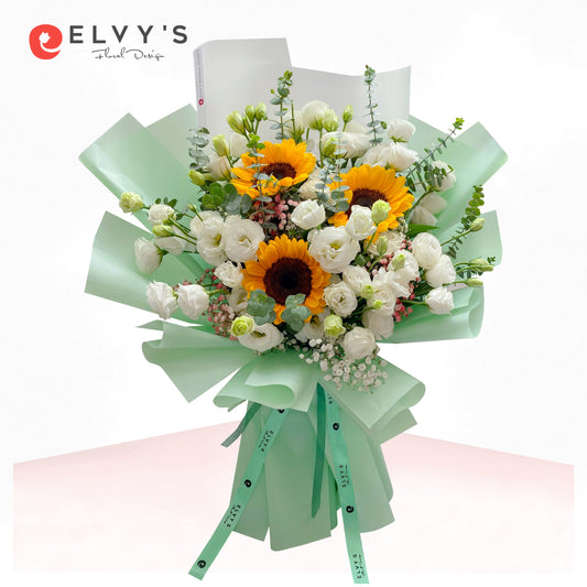 Flower DetailsMain: Sunflower, carnations, and lisianthusFiller: ChamomileSize: Approx. 50.8cm This bouquet is all beautifully presented...