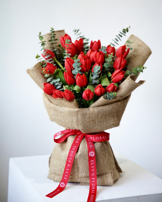 Product Details: Crimson Main Flowers: 24 Red Holland Tulips Fillers: Eucalyptus Foliage Size: Approx. 50–60...
