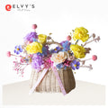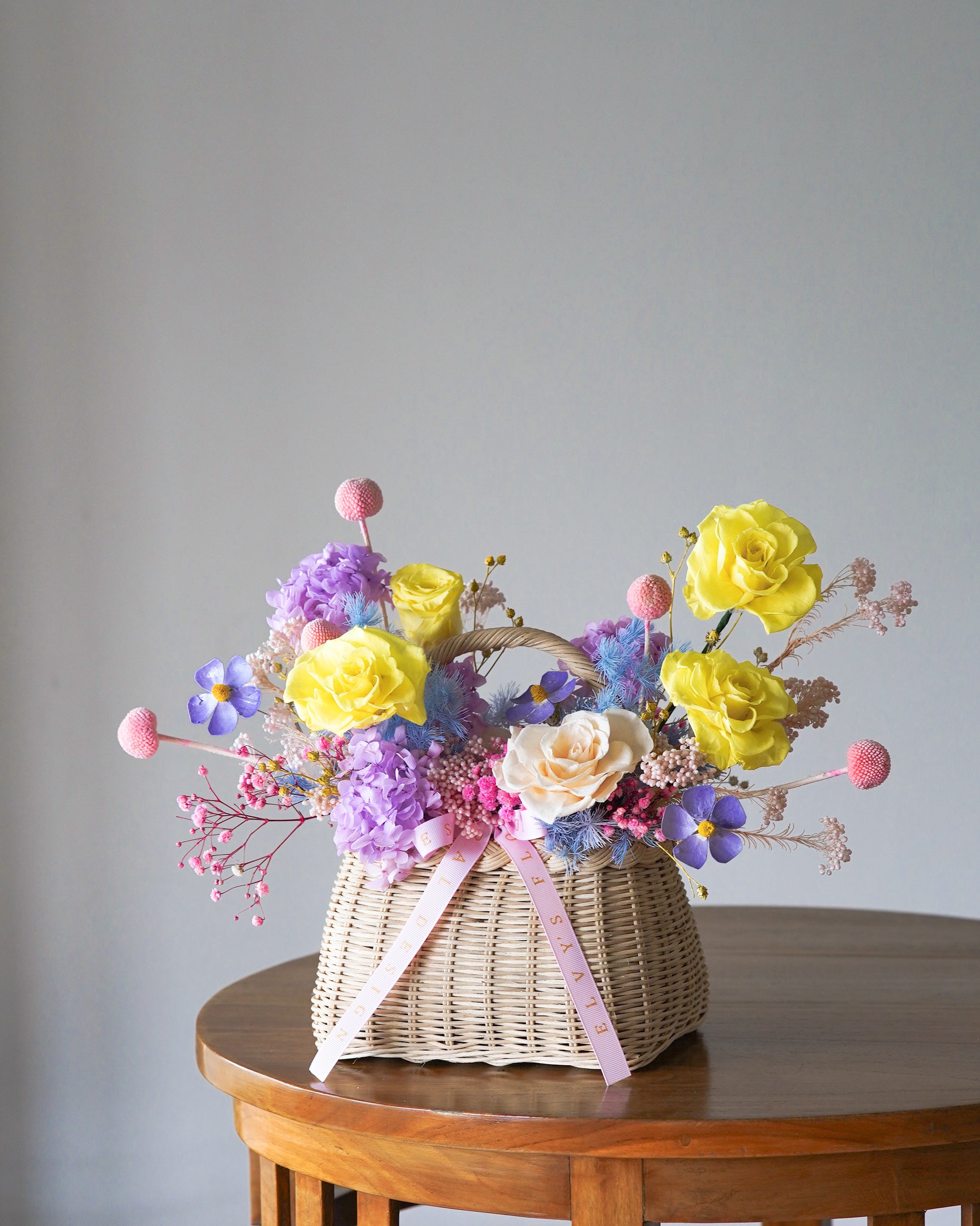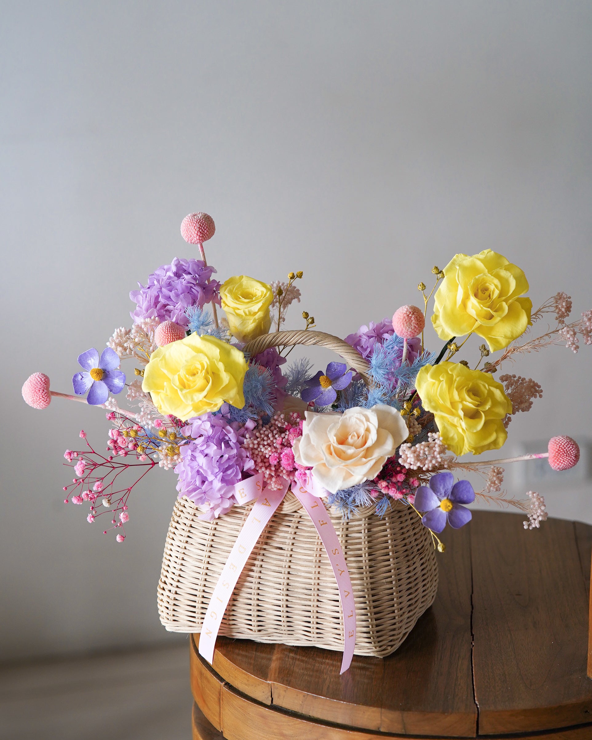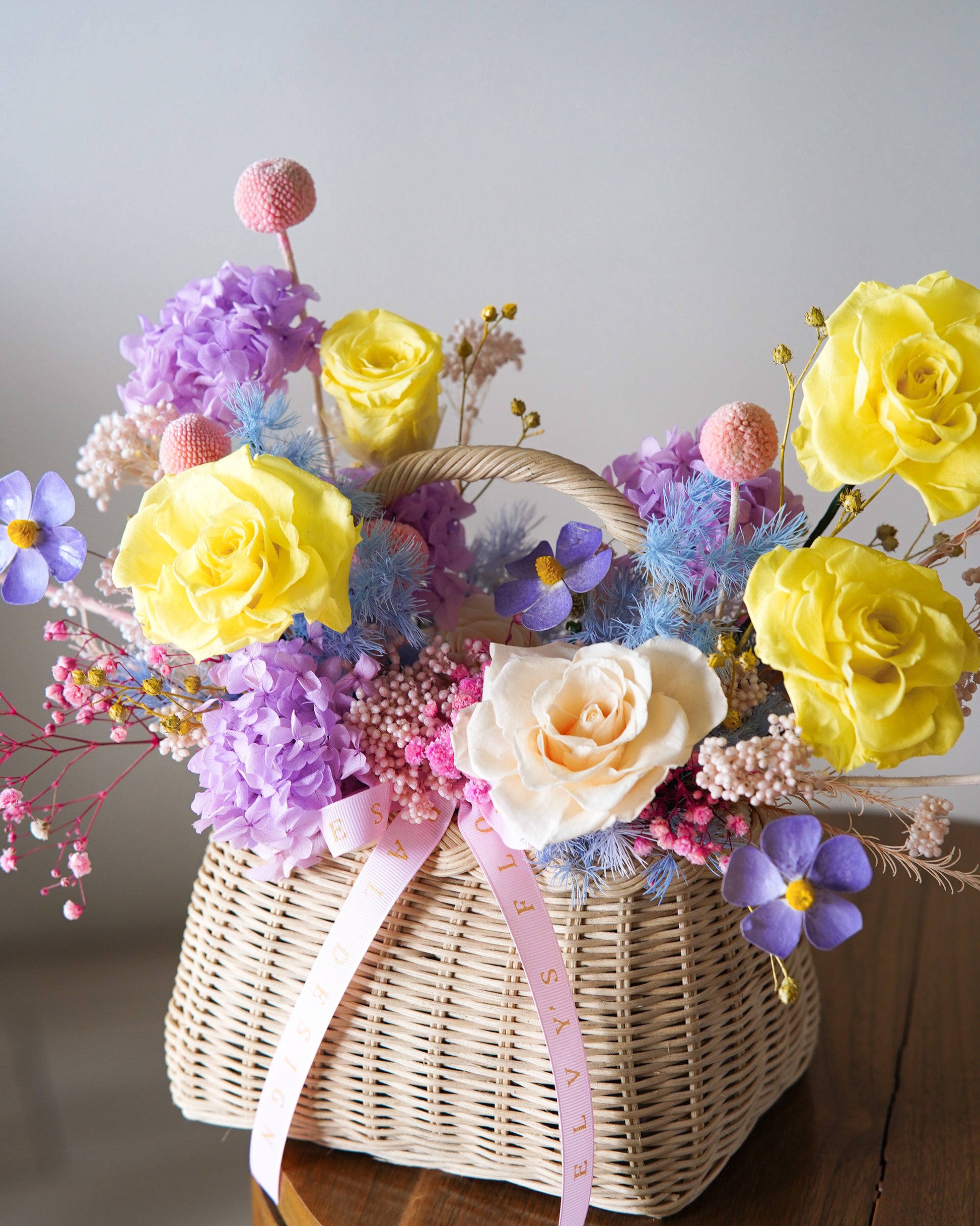 Introducing our basket arrangement filled with lilac, blue and yellow colored blooms including pink highlights to round up a sophisticated design.