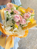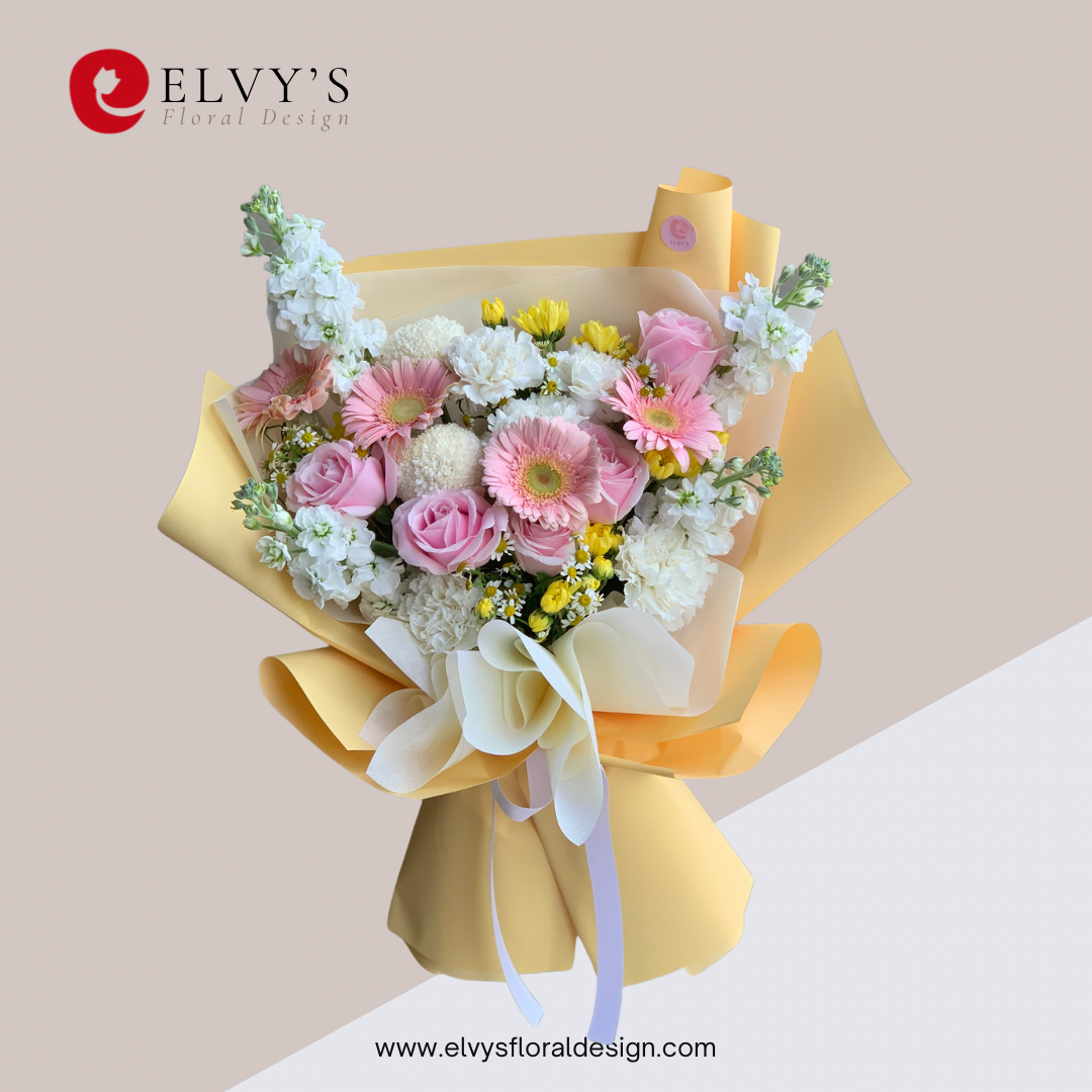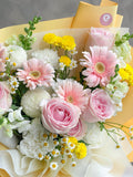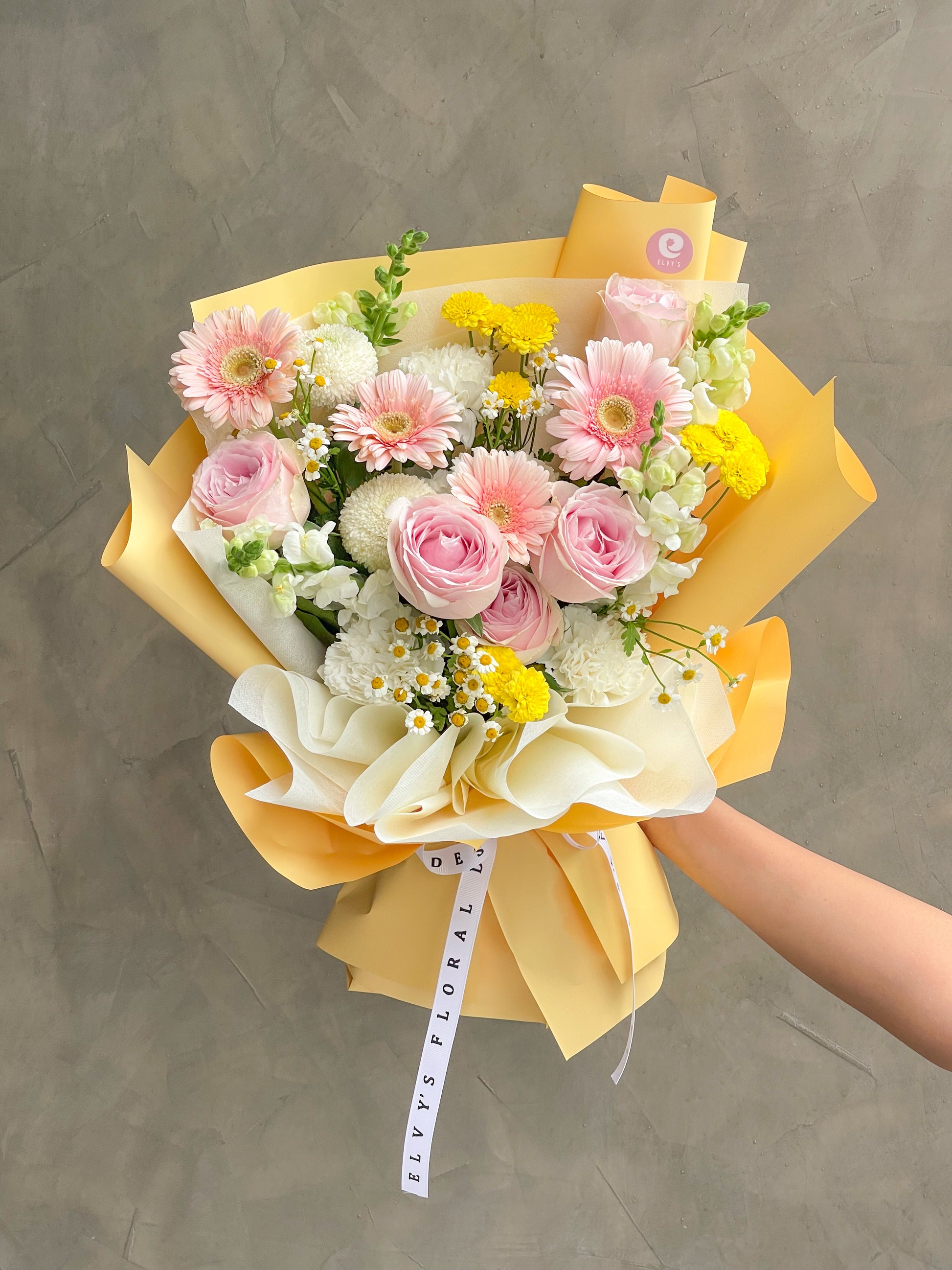 Description: Bring a cheerful yet delicate touch to your Valentine's Day celebrations with Bright but Light. This charming bouquet combines the vibrant hues of gerbera and Malaysian mums with the soft tones of Holland roses and carnations, accented by snapdragon and chamomile. Its radiant yet refined design is perfect for expressing love, gratitude, or warm wishes.