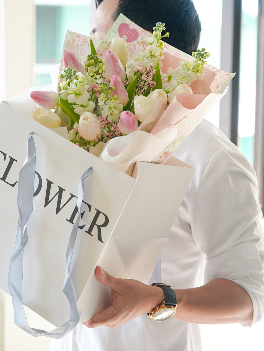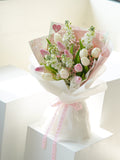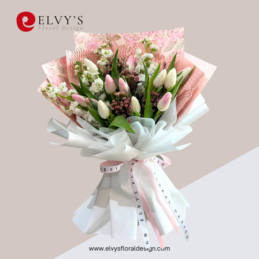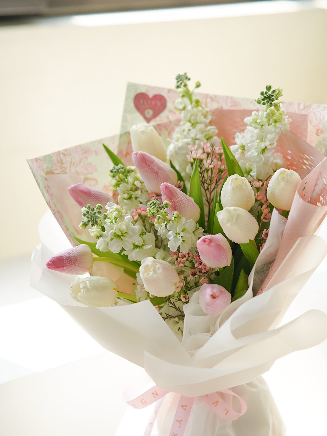 Description: Bubbly showcases a stunning combination of blush and white Holland tulips complemented by delicate Mattiola and wax flowers. Elegantly wrapped in frosted paper, this bouquet is perfect for making any occasion memorable with its soft tones and charming beauty.