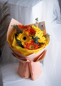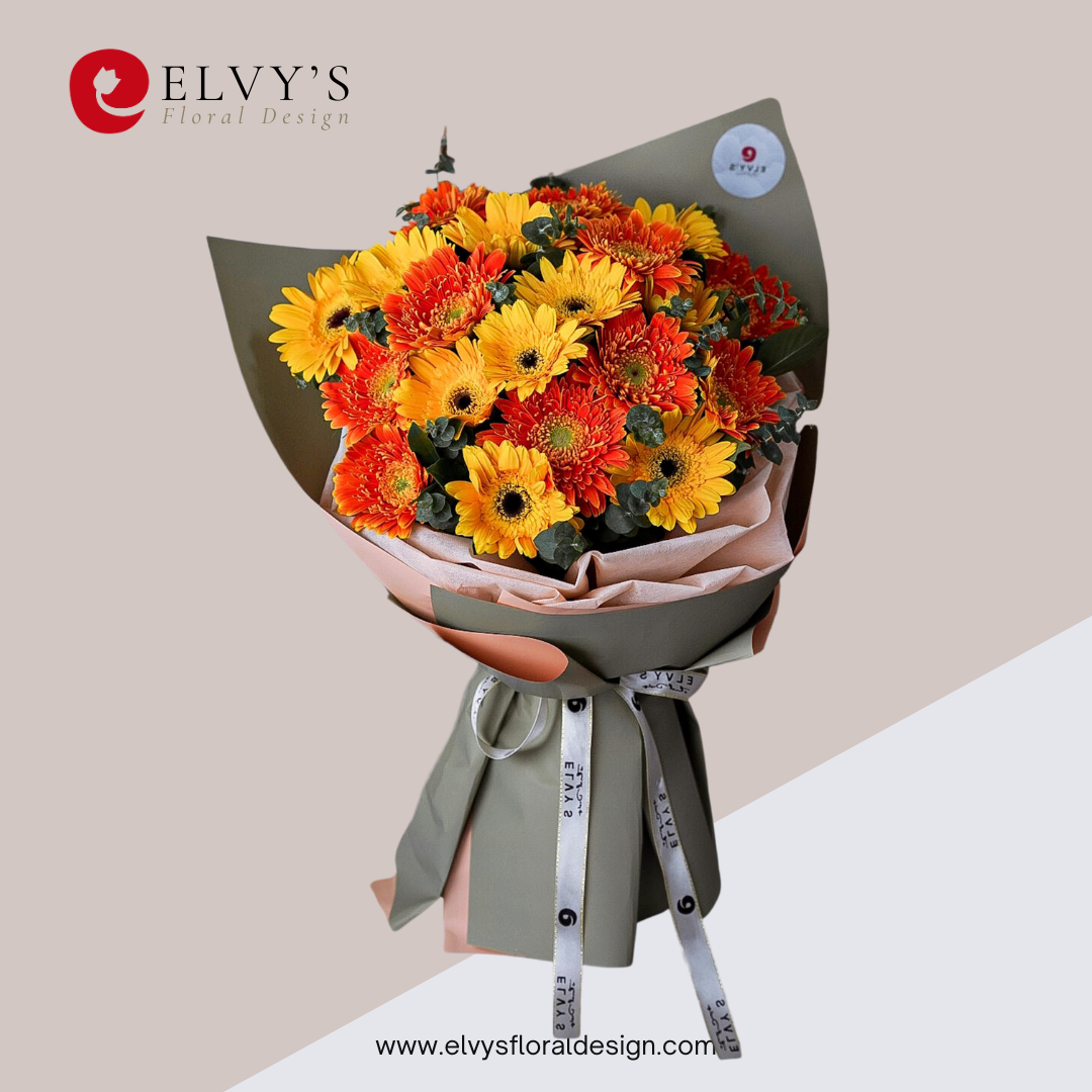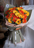 The arrangement features vibrant flowers of orange and yellow gerbera, expertly arranged to create a striking display.