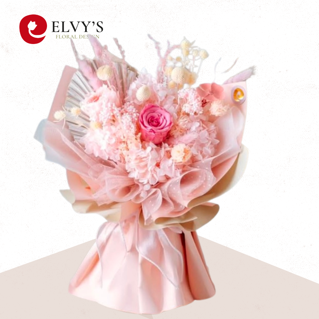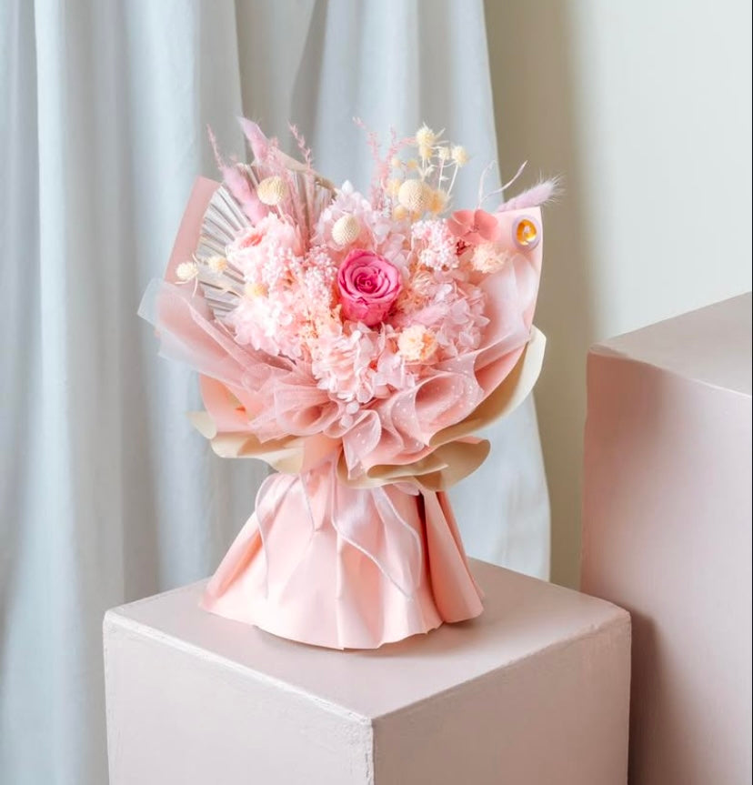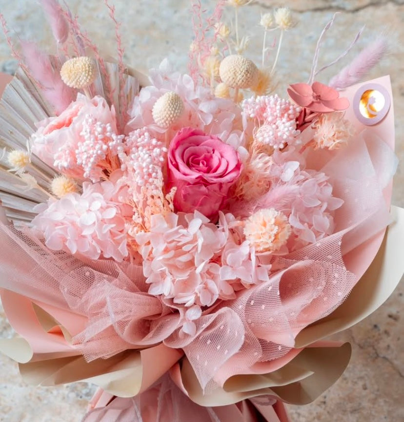 Description: The "Candies Be Love" Bouquet is a sweet and vibrant arrangement bursting with lively pink hues and delightful textures. Featuring a hot pink preserved rose and a soft Austin pink rose as the focal points, this bouquet is complemented by whimsical fillers like scabiosa, rice flowers, and hydrangeas. Perfect for expressing love, admiration, or heartfelt joy, this bouquet adds a playful yet elegant touch to any special occasion.