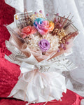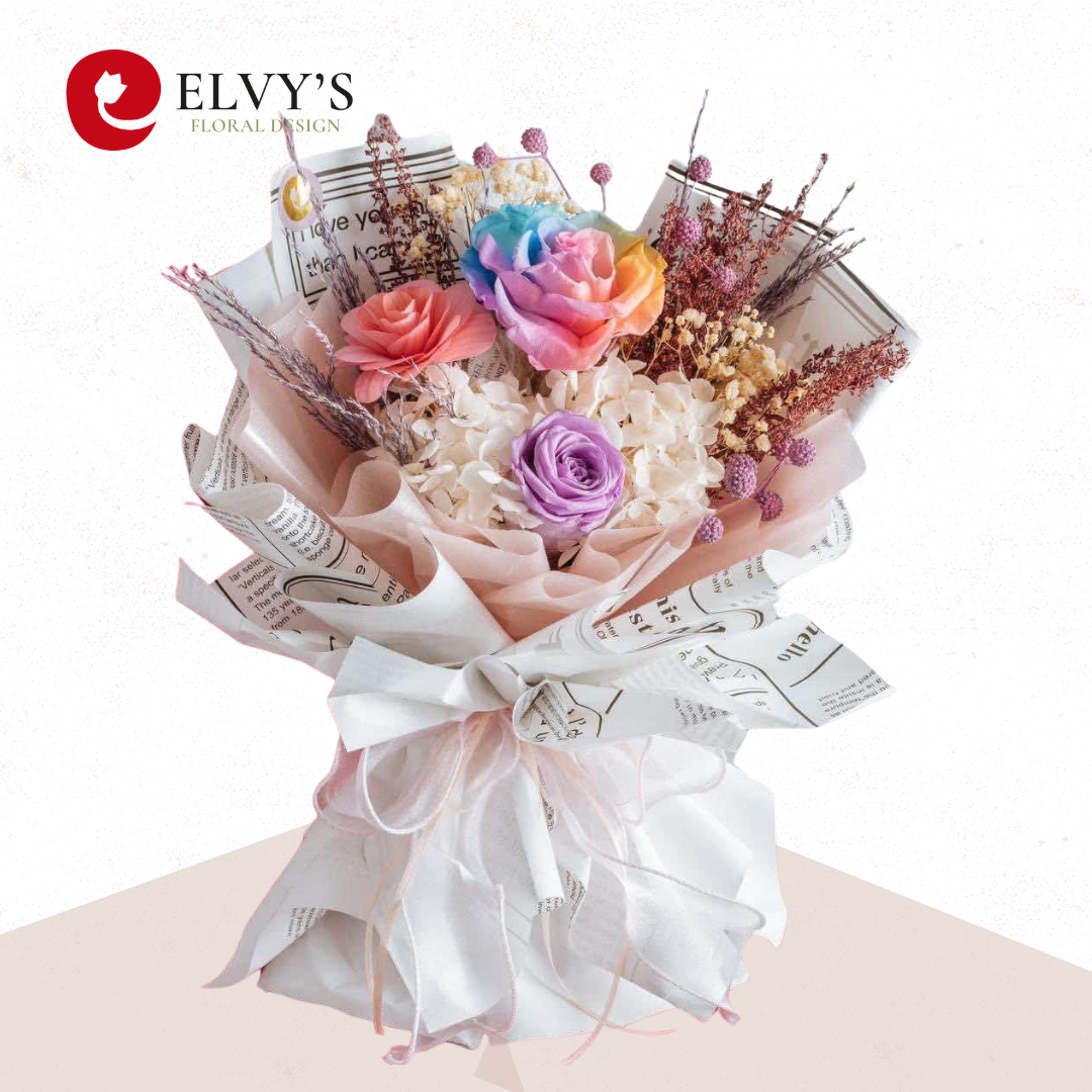 Description: The "Chalky Pastel" Bouquet is a vibrant blend of whimsical hues and soft textures, featuring a stunning rainbow-preserved rose, delicate lilac rose, and a charming pink wooden flower. Accented with pastel fillers, hydrangeas, and pampas grass, this bouquet embodies the essence of joy and creativity. Perfect for spreading cheer or celebrating colorful moments, it’s a delightful gift for any occasion.