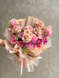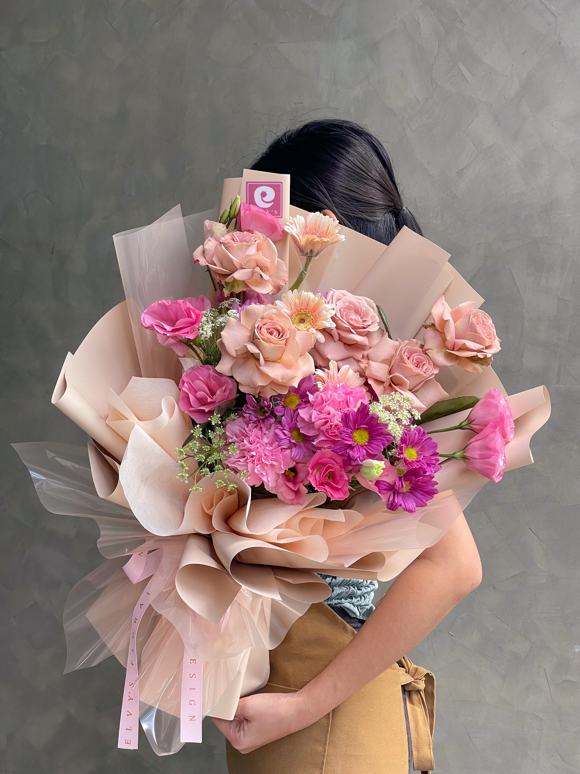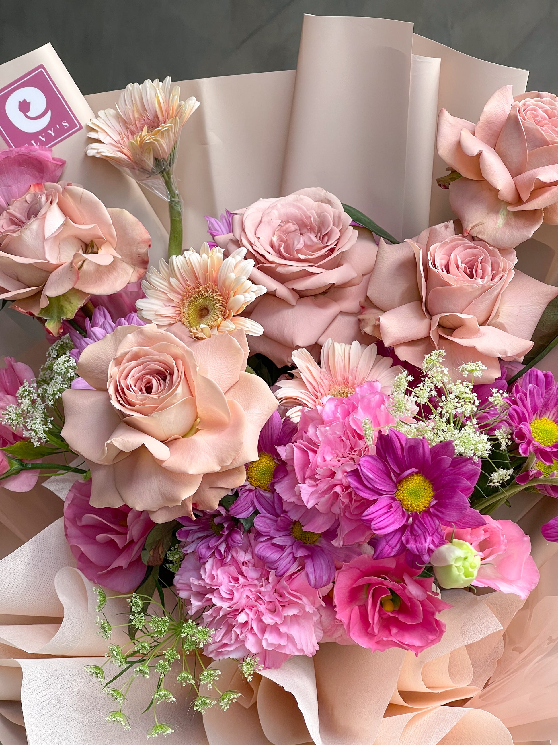 Description: Celebrate the beauty of love this Valentine’s Day with Champagne Pink. This premium bouquet, crafted in our signature style, combines the luxurious charm of Holland roses, carnations, and lisianthus with the playful elegance of gerbera, mums, and Queen Anne's lace. With its soft pink and rose tones, this arrangement is perfect for expressing your heartfelt emotions in a modern and stylish way.