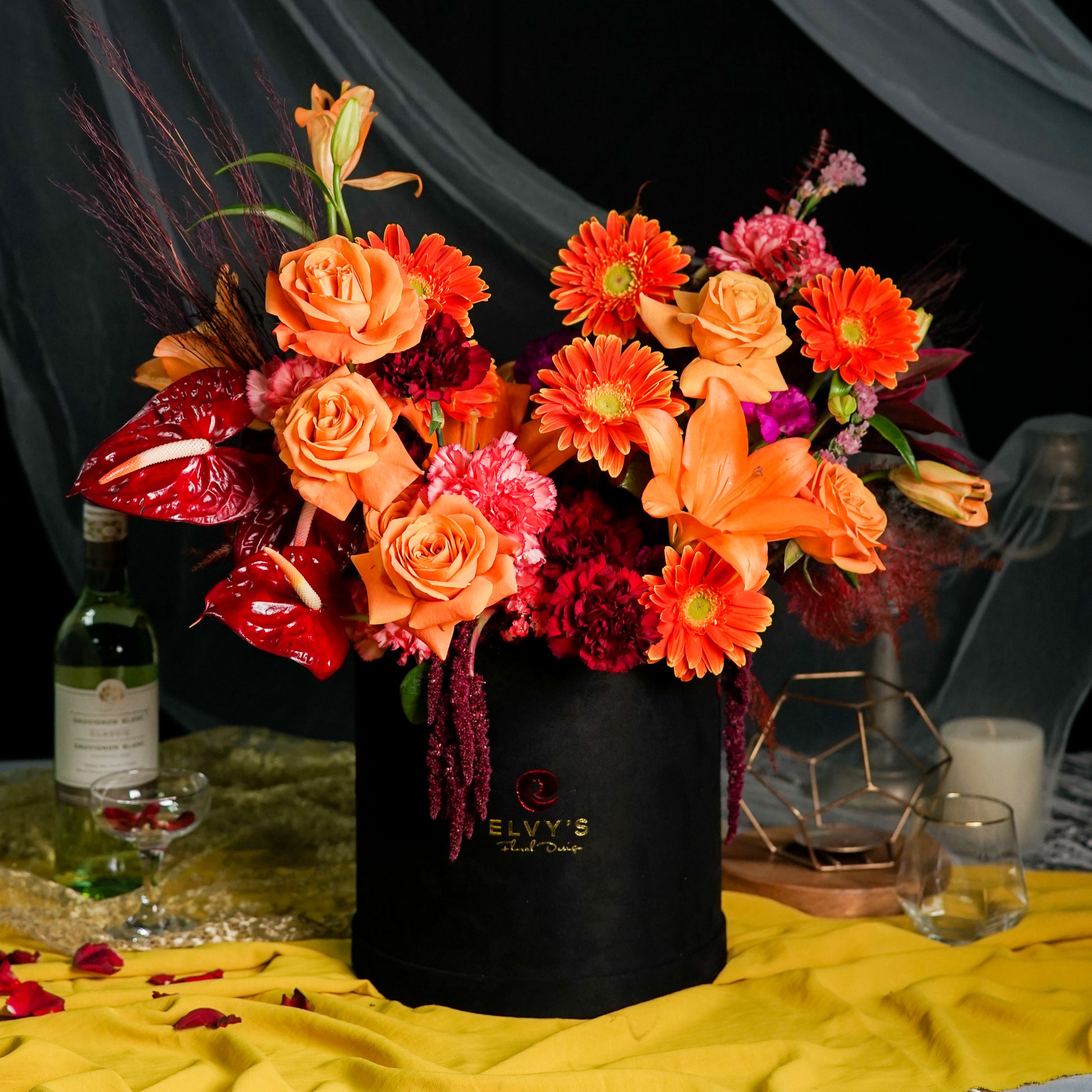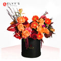 Giant Velvety Bloom Box, a stunning floral arrangement that exudes elegance and grandeur. Encased in a luxurious black box.