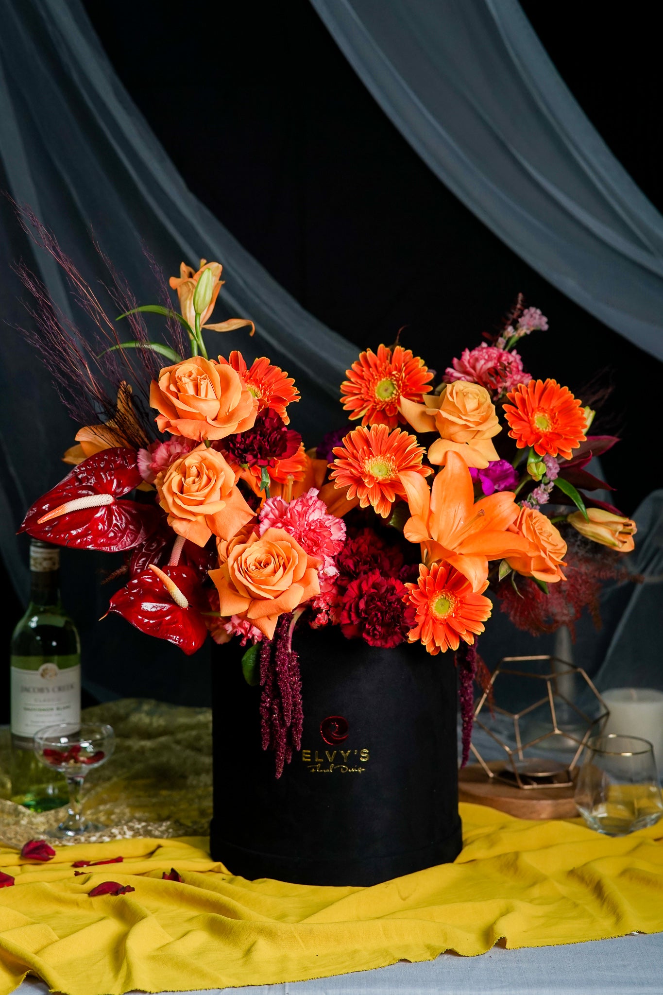Flower Inclusions: Stargazer, gerbera, carnation, Amaranthus, and dried fillers