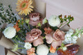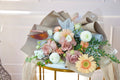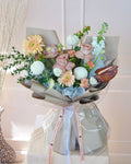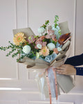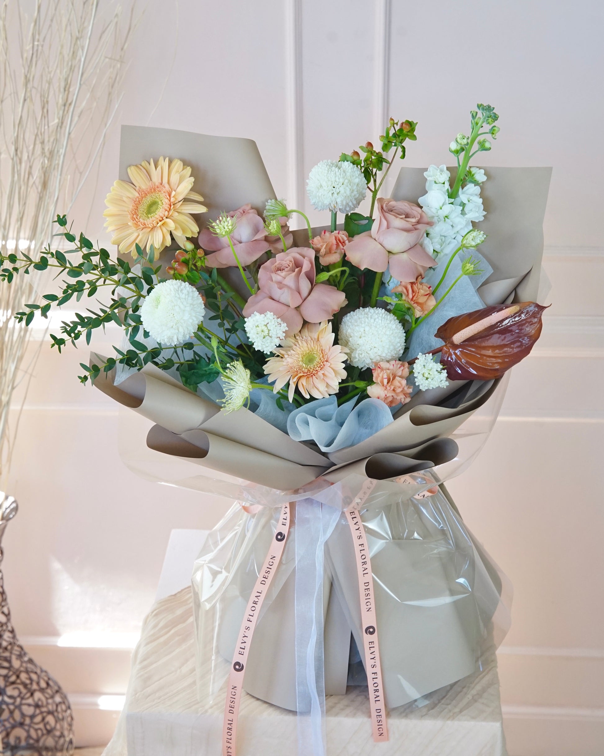 Main Flowers: Brown Holland Rose, Peach Gerbera, White Pingpong Chrysanthemum
