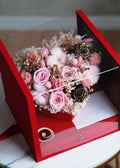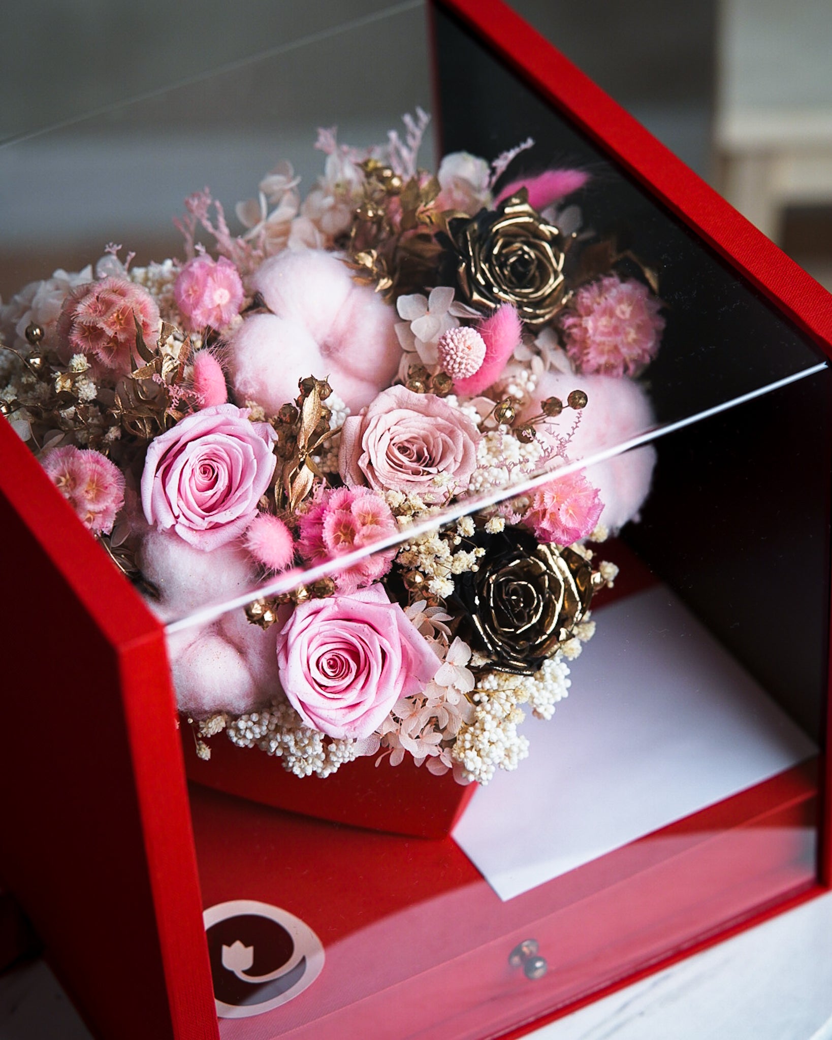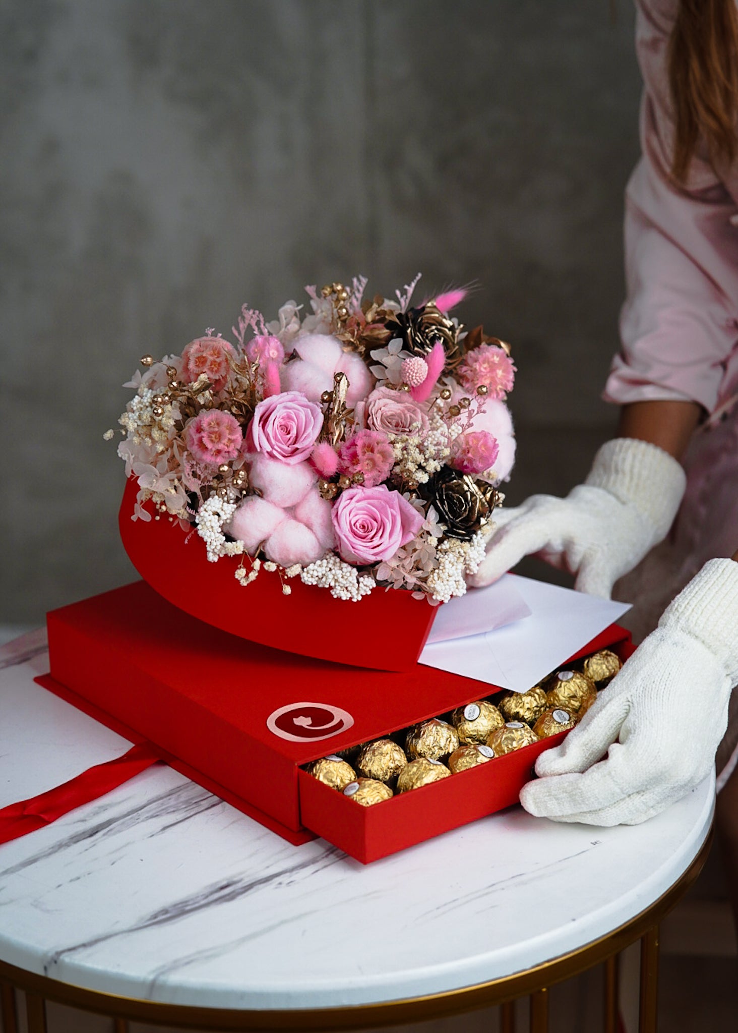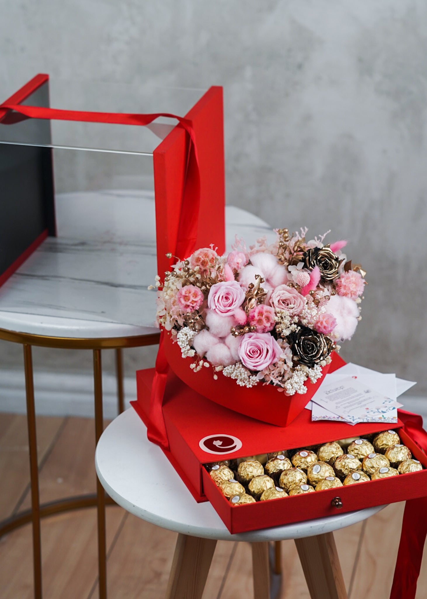 A dried flower in a box such as preserve rose, scabiosa, gypsophilia, valentines fruit, cotton, hydrangeas, and rice flower. Box includes of 30pcs Ferrero rocher chocolate