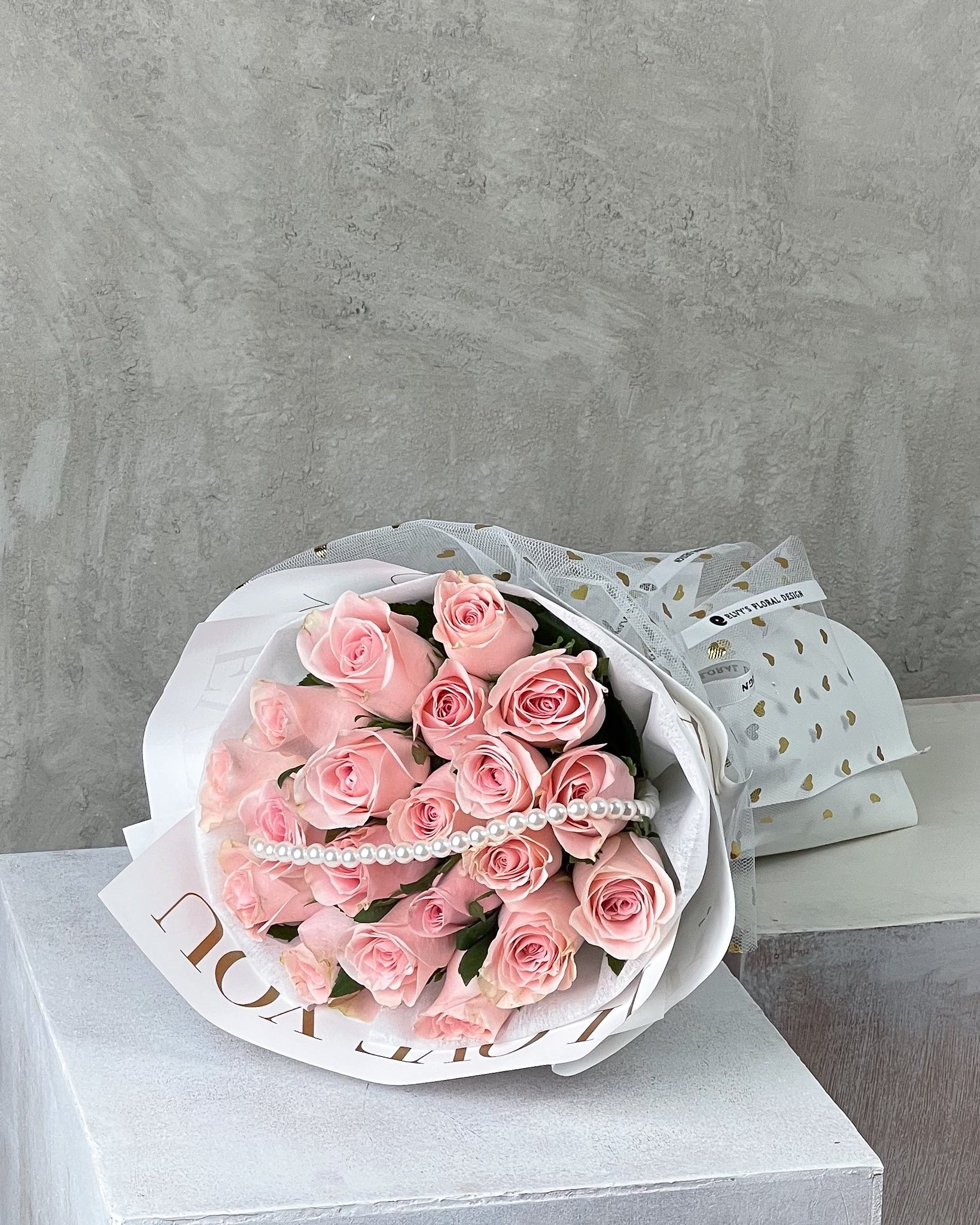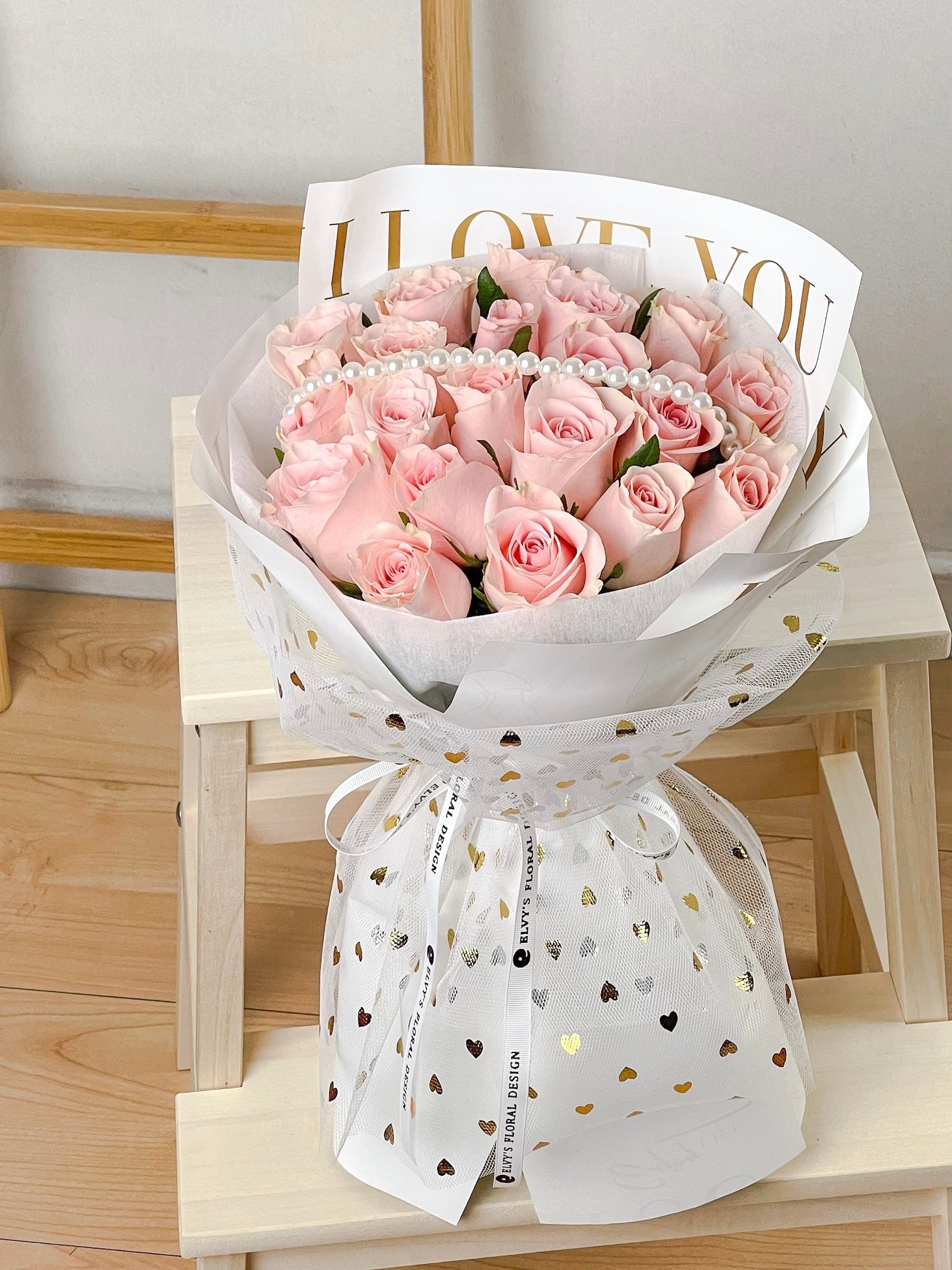 Flower Inclusions: 20 delicate blush Holland roses, elegantly adorned with a pearlescent accent, Adding an extra touch of sentiment, the bouquet is embellished with a heartfelt "I love you" text
