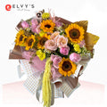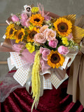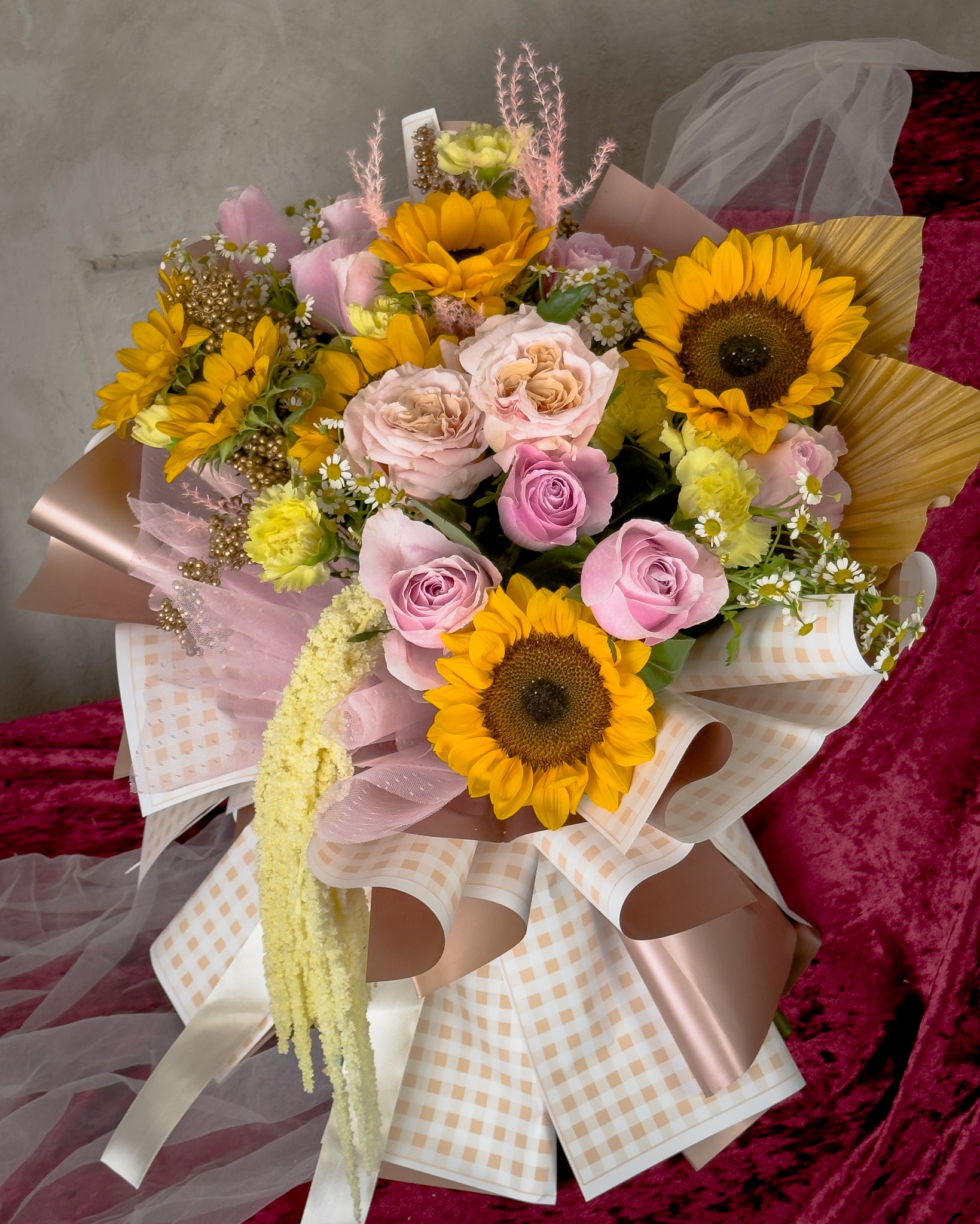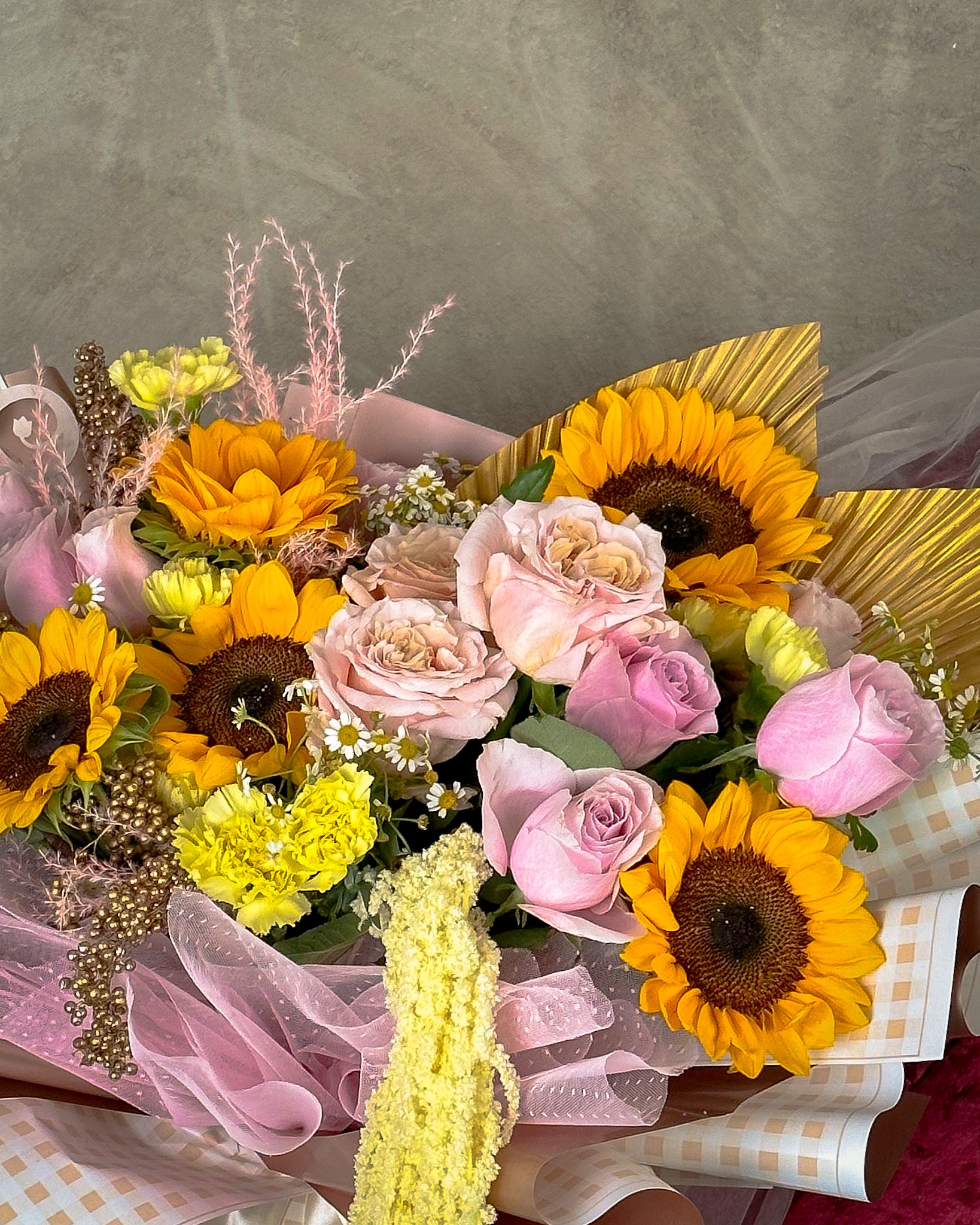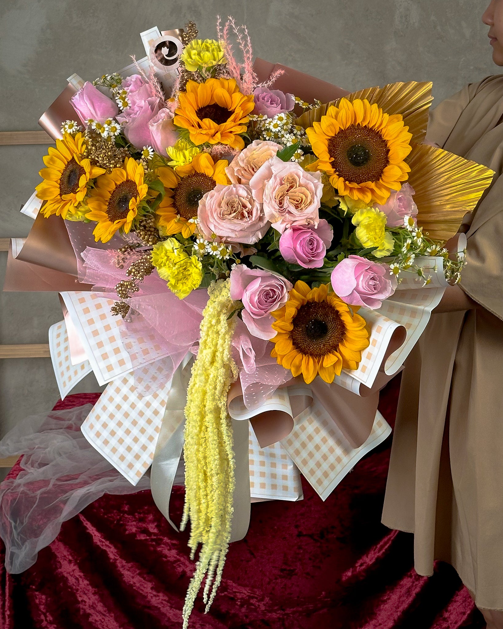Introducing our premium signature design bouquet, a masterpiece in a breathtaking blush and yellow gold motif. This opulent arrangement combines an array of exquisite blooms and textures to create a truly remarkable display.