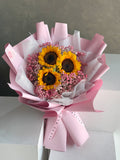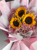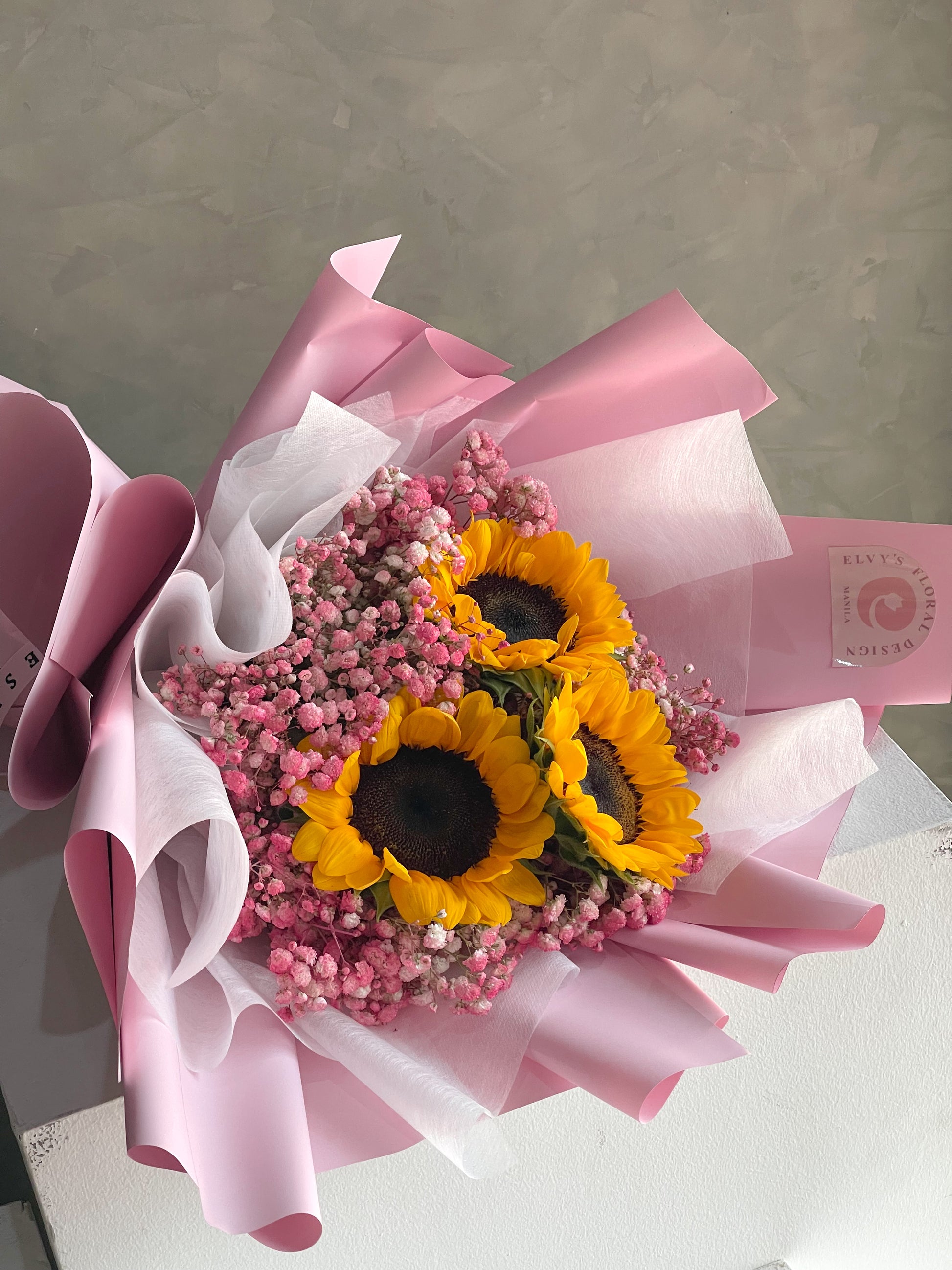 We make sure to highlight smaller bouquets by choosing high-quality sunflowers and delicate pink fillers, balancing them out in an elegant arrangement.