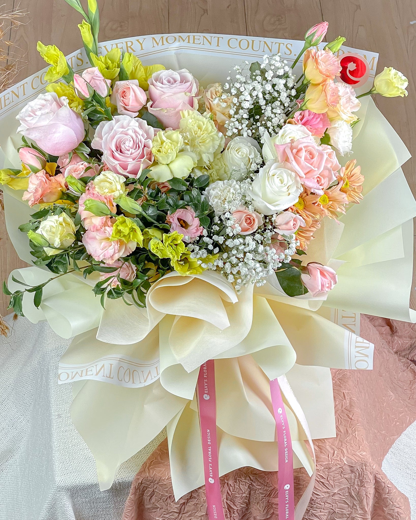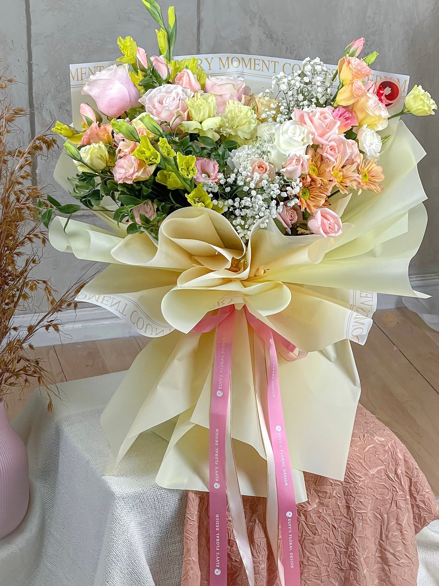 This signature design bouquet is perfect for special occasions, celebrations, or as an impressive gift to express love, admiration, or appreciation. Its exquisite blend of colors, premium blooms, and expert craftsmanship make it a true masterpiece, guaranteed to make a lasting impression on its recipient.