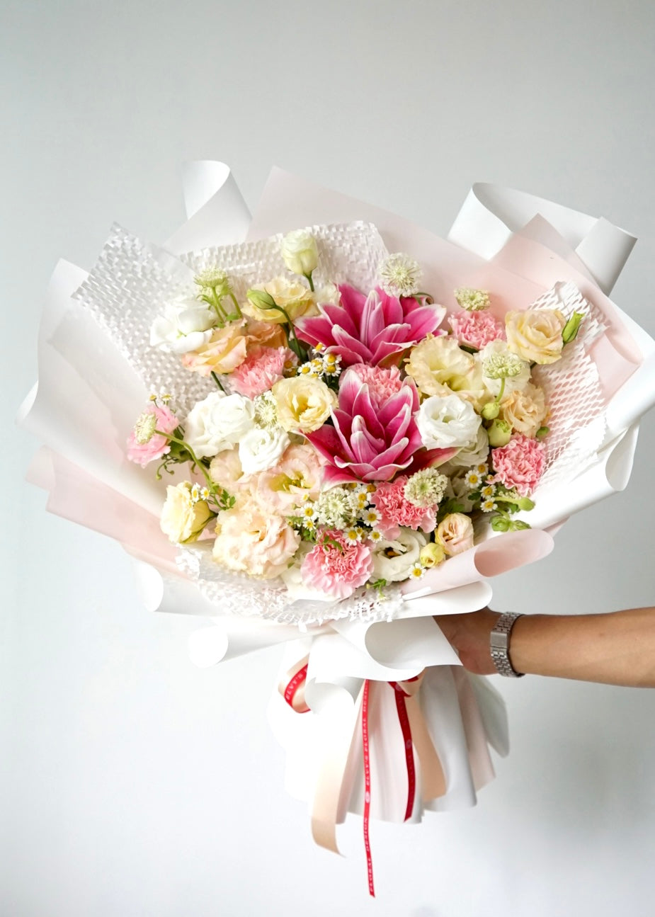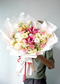 - Description: Lily Blush features stargazer lilies at the heart of the arrangement, complemented by blush and cream seasonal blooms. Finished in soft pastel wrapping.