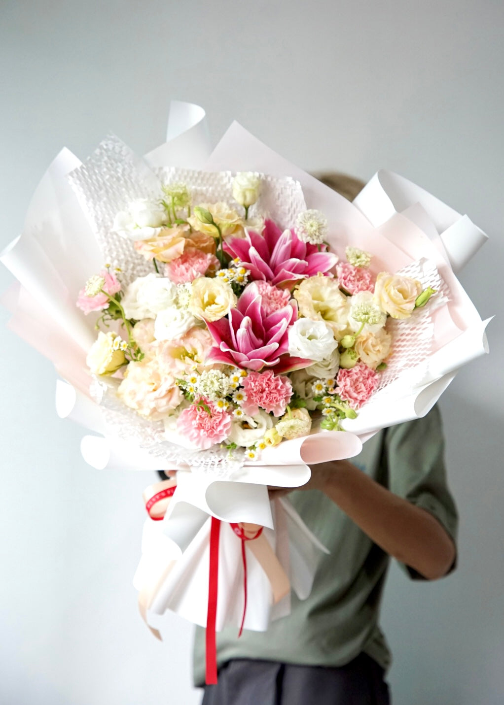 - Main Flowers: Stargazer lilies, Pink Carnations,