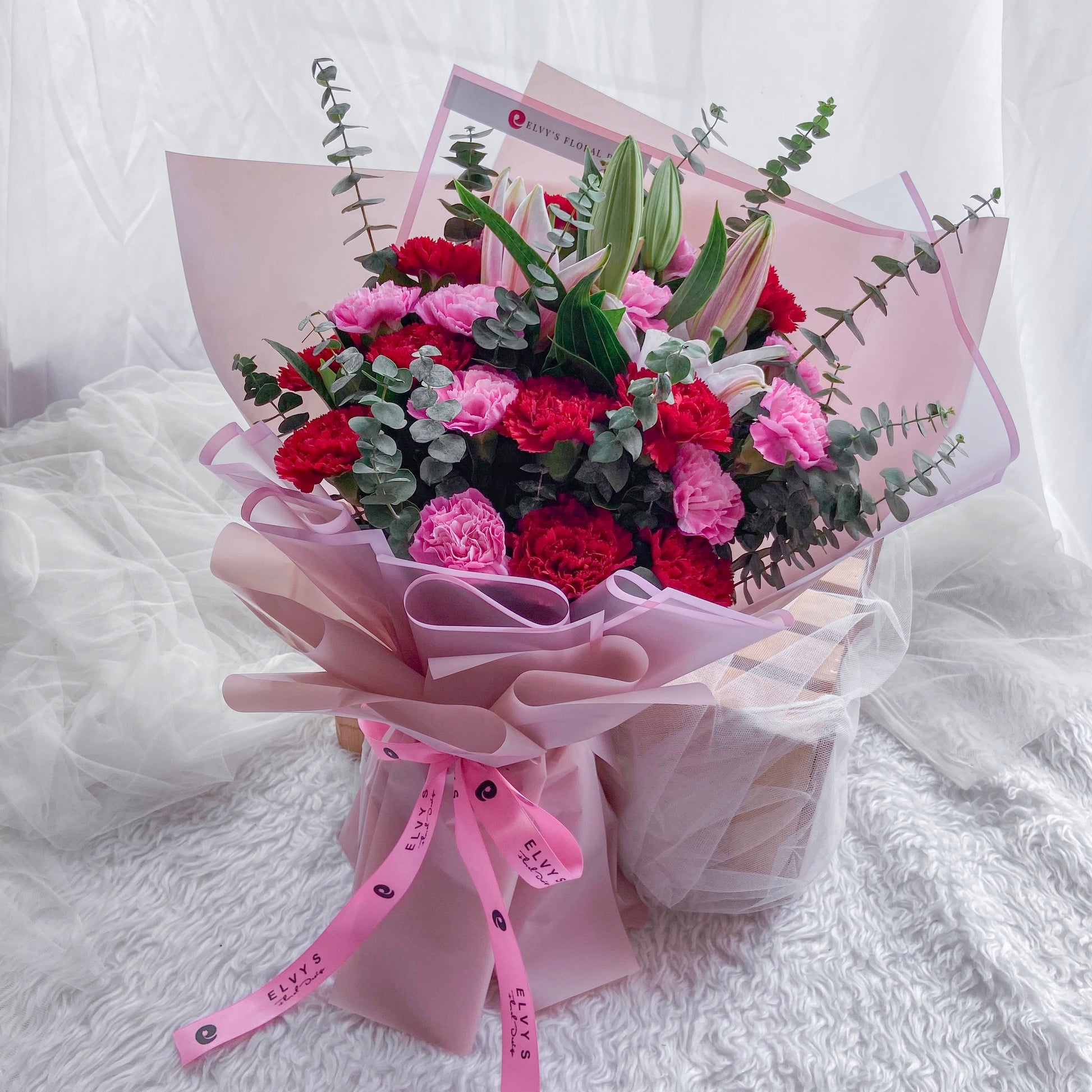 Flower Inclusions: 20 stems carnations, stargazer, and eucalyptus