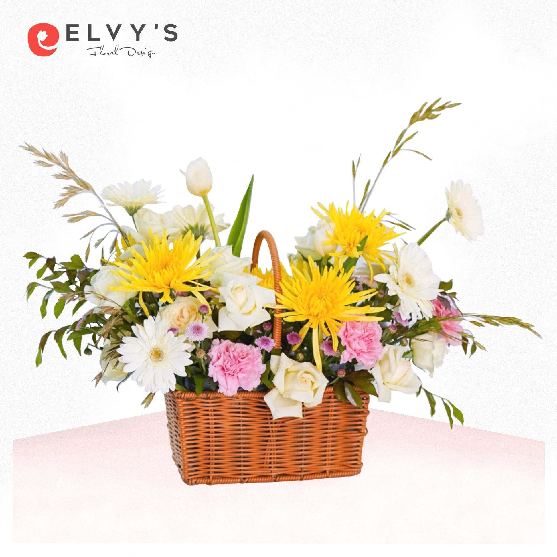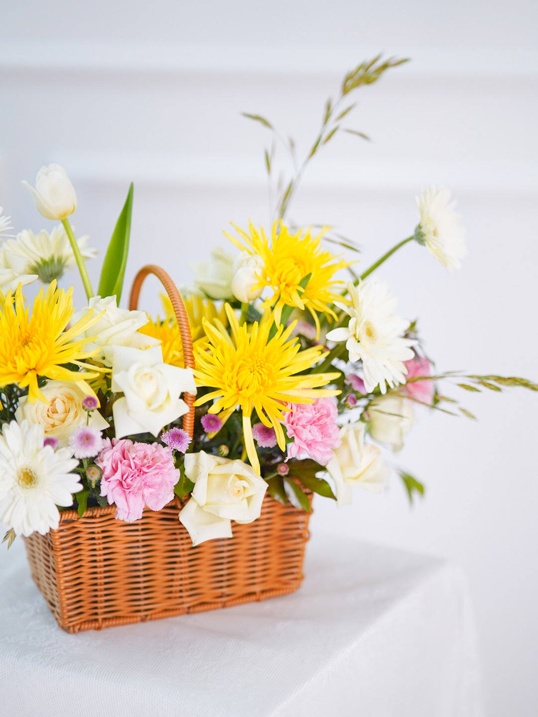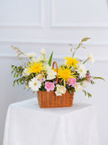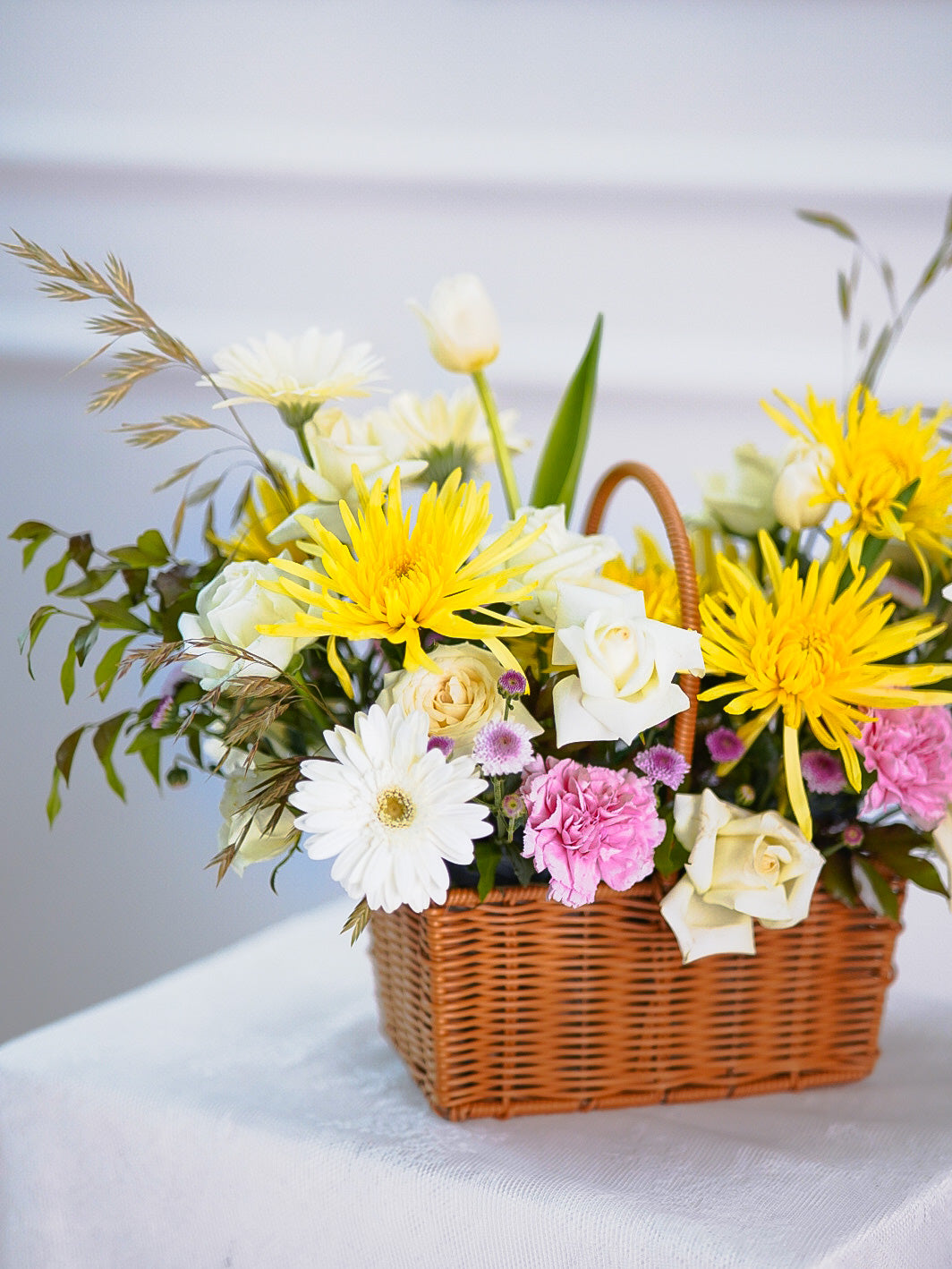 We created this basket arrangement to present the beauty of natural wildflowers with yellow, pink and white blooms in a light and traditional style.